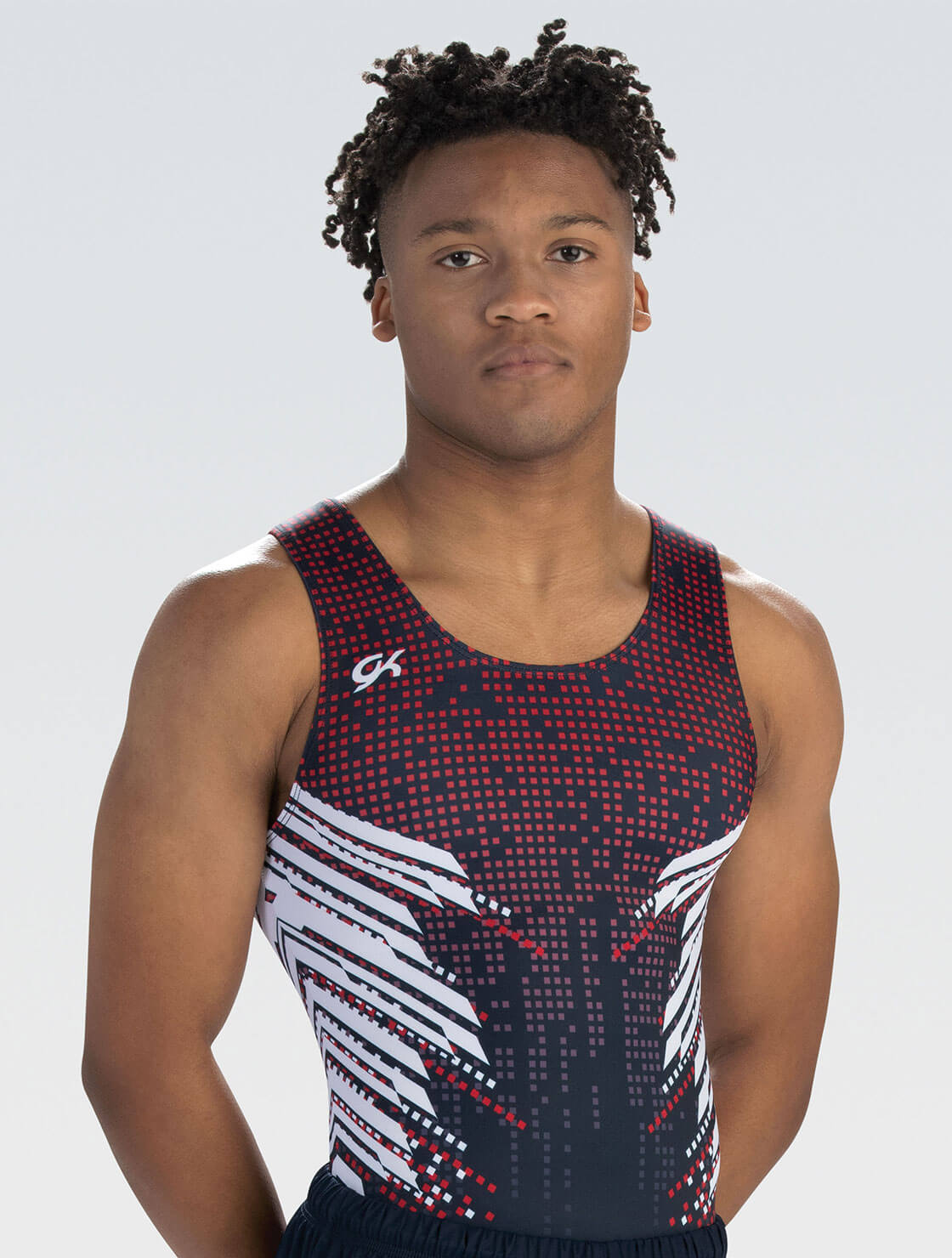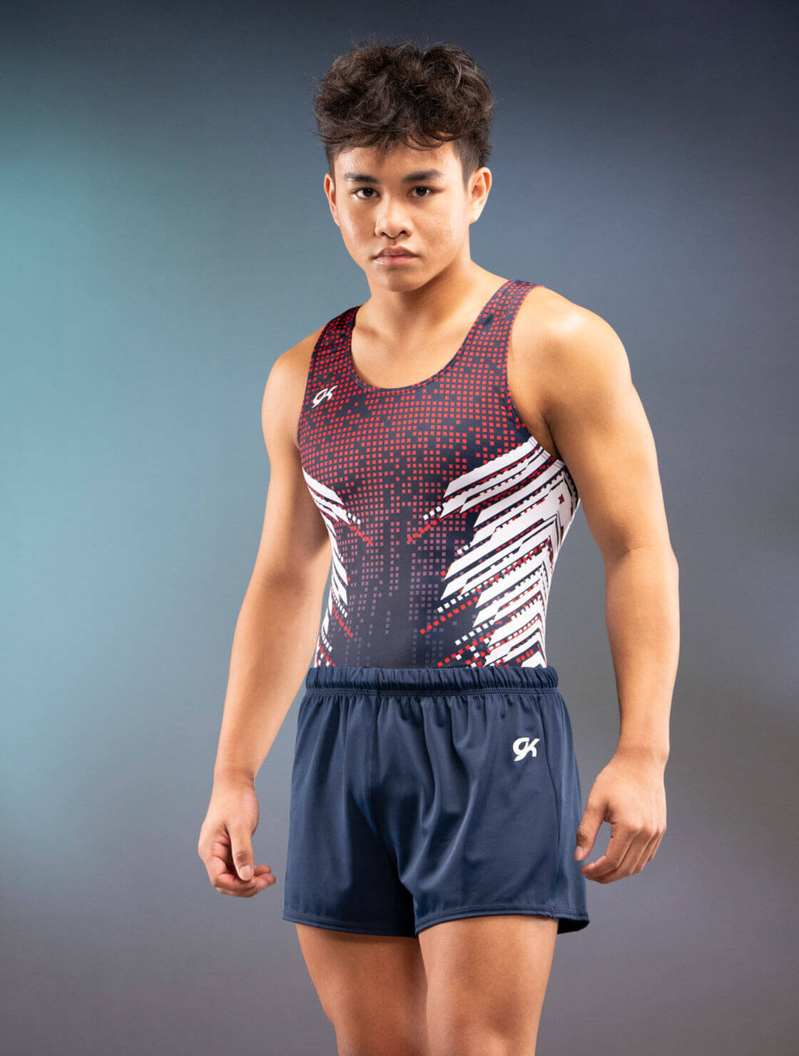 This competition leotard for men and boys is perfect for a day training or competing! Sublimated on polytek with a red, white, and navy design with slanted side stripes pointing inward, this men's gymnastics leotard is perfect for any occasion.